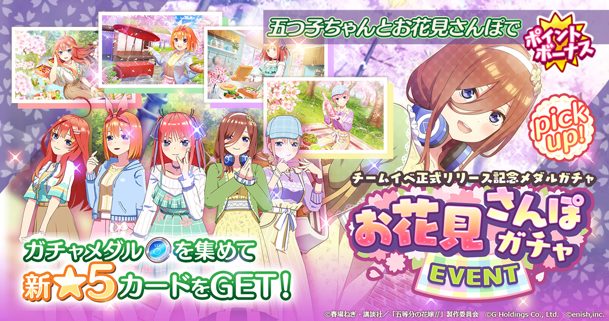 『五等分の花嫁 五つ子ちゃんはパズルを五等分できない。(ごとぱず)』にて、2021年3月18日(木)11:00より、イベント「五つ子ちゃんとお花見さんぽ~場所取り名人はだ~れ?~」が開催されます。