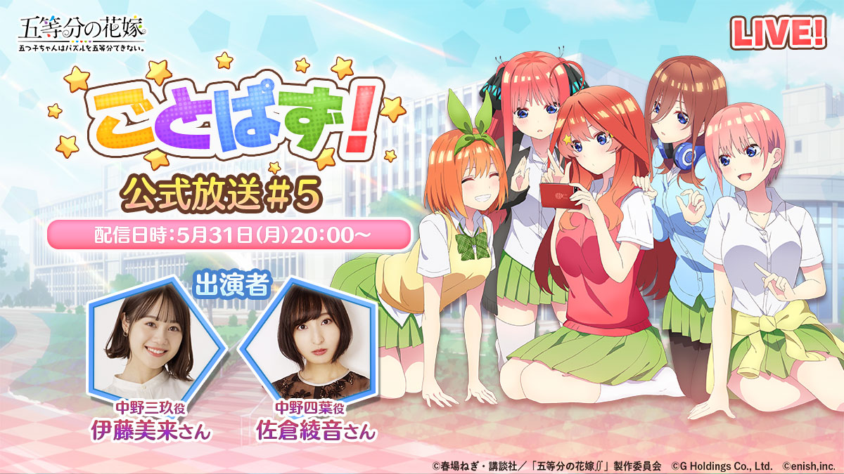 『五等分の花嫁 五つ子ちゃんはパズルを五等分できない。(ごとぱず)』にて、2021年5月31日(月)20:00より、「ごとぱず!公式放送#5」が配信されます。