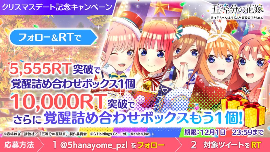 — 『五等分の花嫁 五つ子ちゃんはパズルを五等分できない。』【ごとぱず】《運営》 (@5hanayome_pzl) December 1, 2021