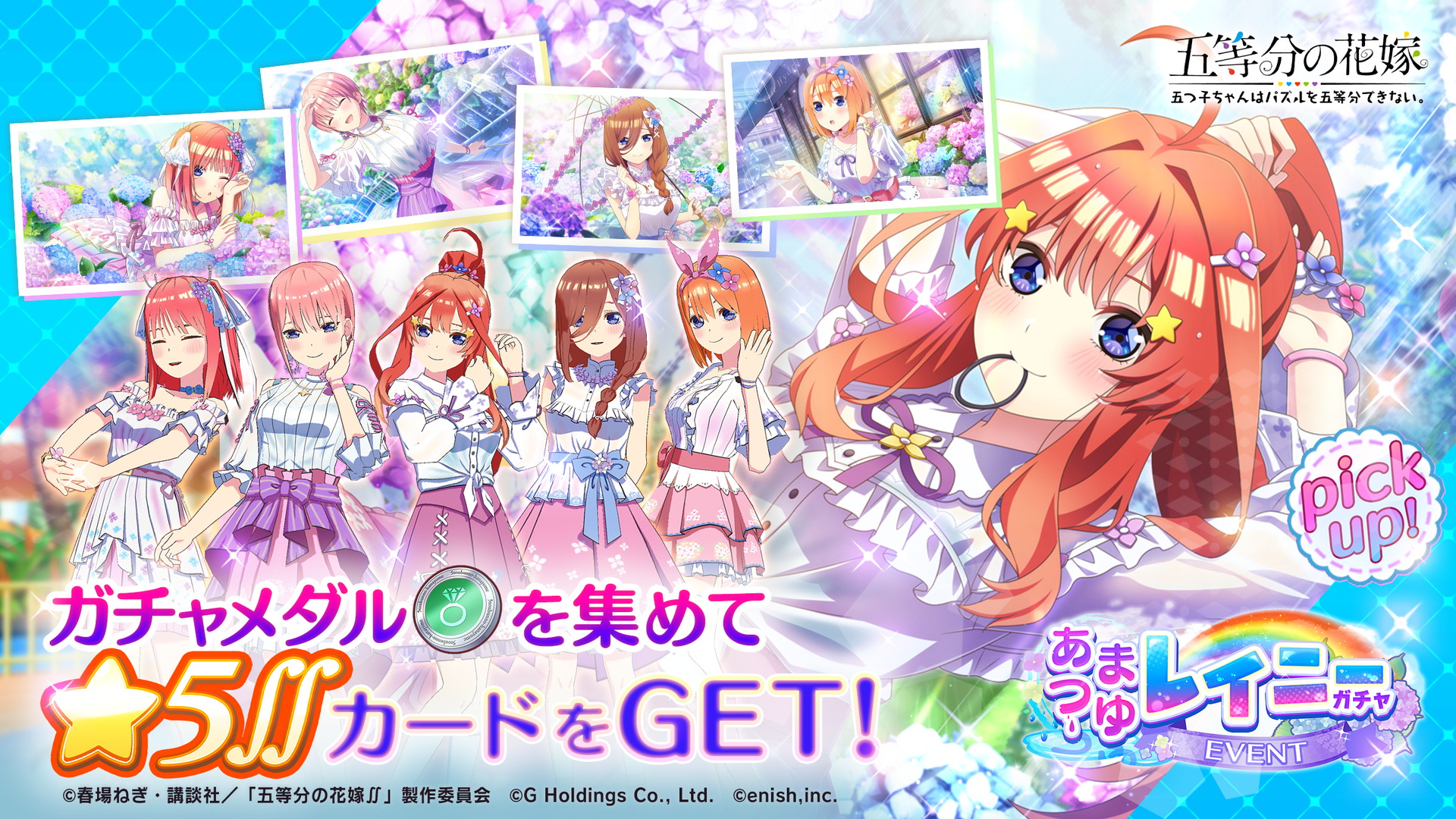 本イベントでは、週刊少年マガジン編集部完全監修による「あまつゆレイニー」をテーマにしたオリジナルストーリーをフルボイスで楽しめるほか、イベントポイントを集めると、五つ子のなかよしレベルを上げることができ、「はいチーズ!」の新しいポーズや背景などを獲得できます。