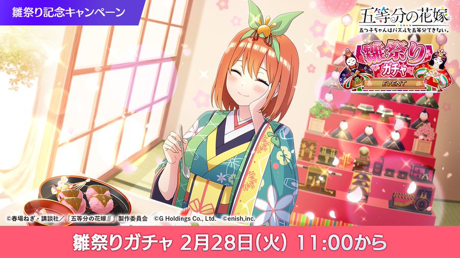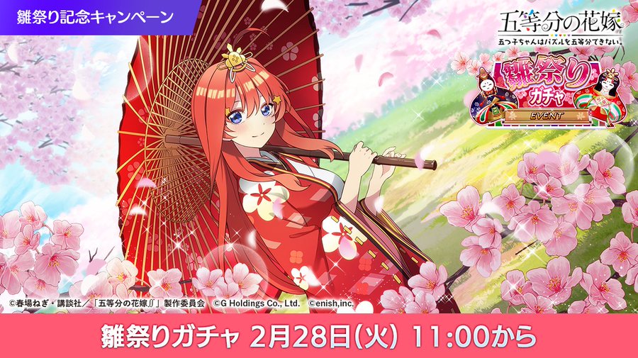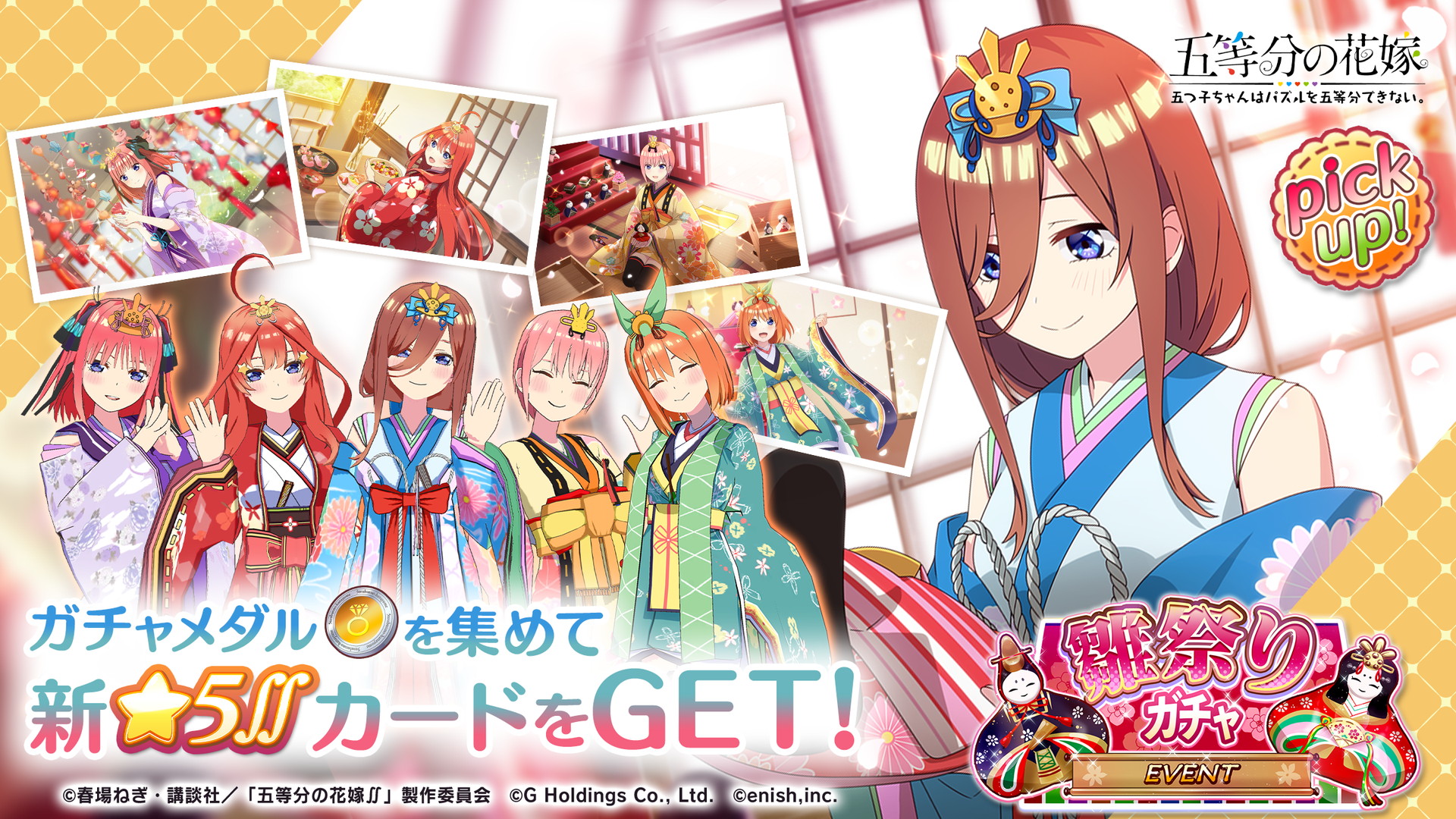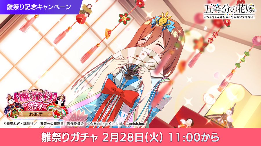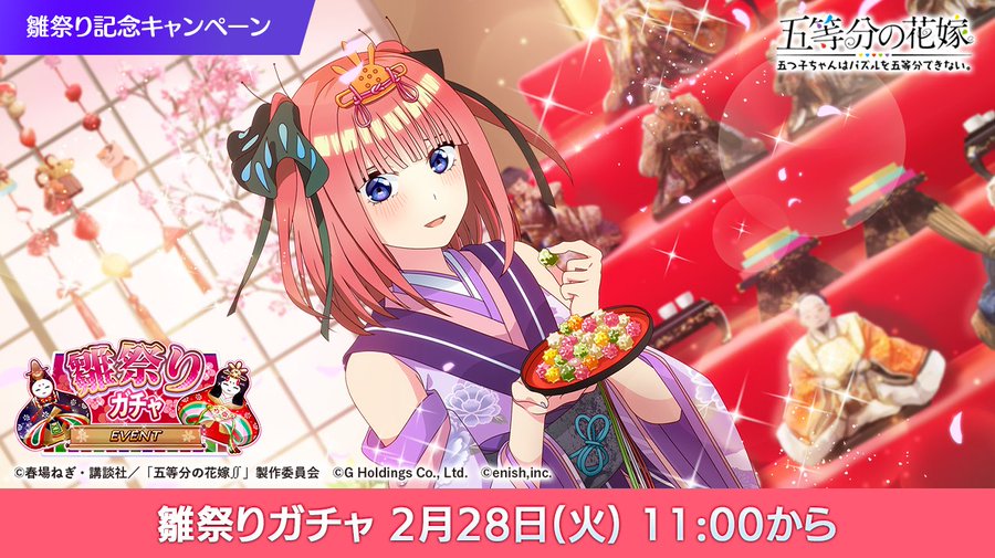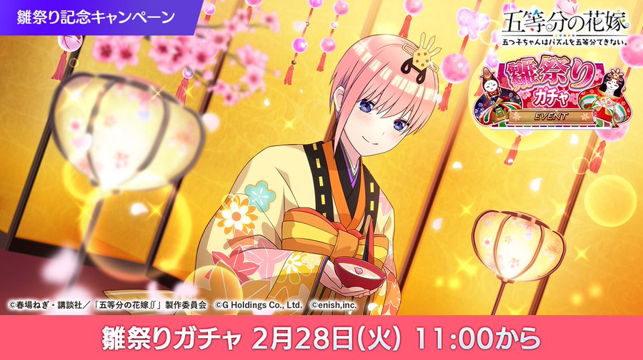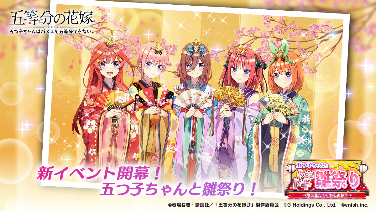 『五等分の花嫁 五つ子ちゃんはパズルを五等分できない。(ごとぱず)』にて、2023年3月3日(金)11:00より、新イベント「五つ子ちゃんとドキドキ雛祭り~隣に並んでくれるよね?~」が開催されます。