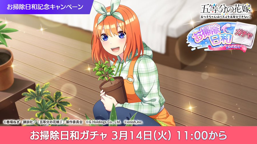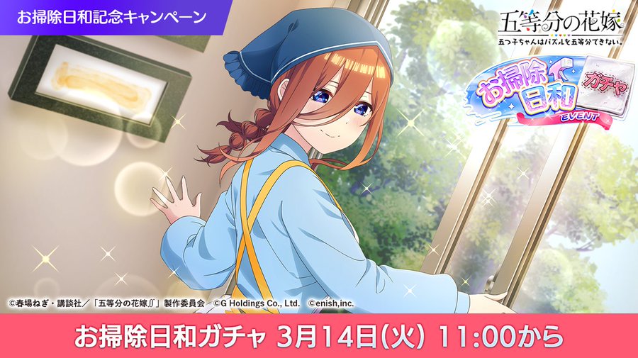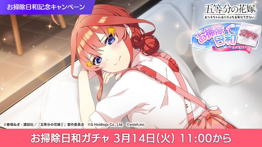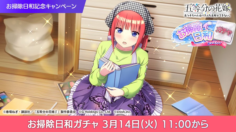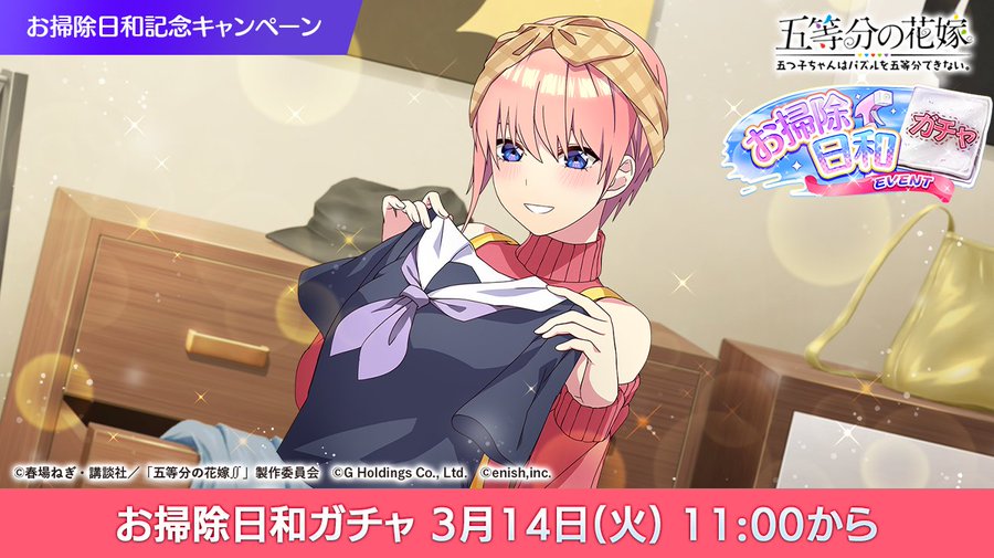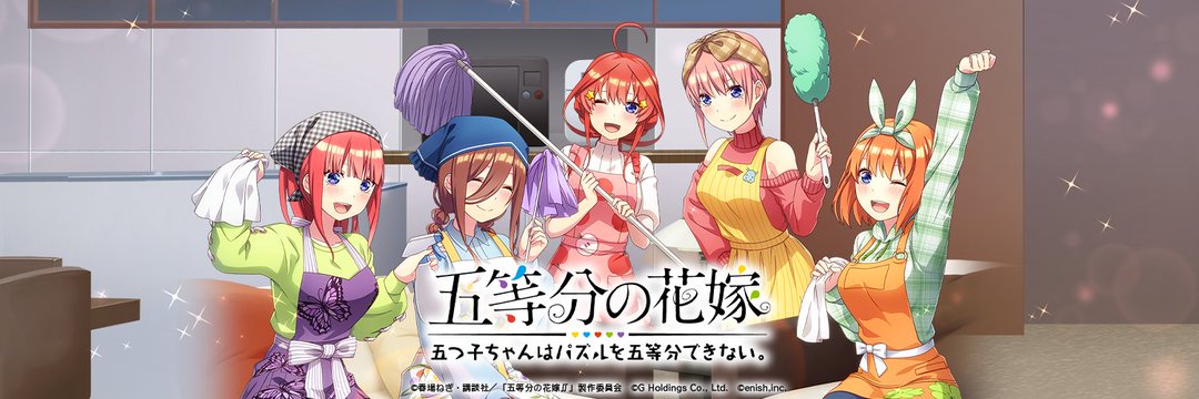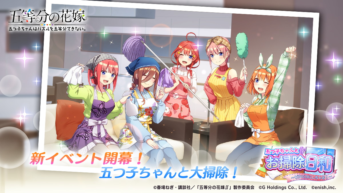 『五等分の花嫁 五つ子ちゃんはパズルを五等分できない。(ごとぱず)』にて、2023年3月17日(金)11:00より、新イベント「五つ子ちゃんとお掃除日和~ピカピカにしちゃお!~」が開催されます。