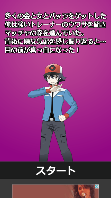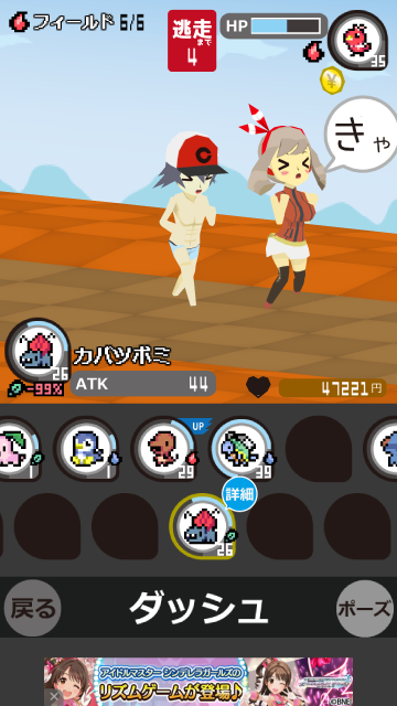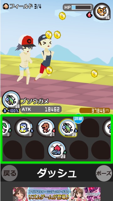 最初はとにかく「ダッシュ」ボタンを連打して疾走!トレーナーに出会うと体当たりし、お金をカツアゲしながらバトルがスタートします。
