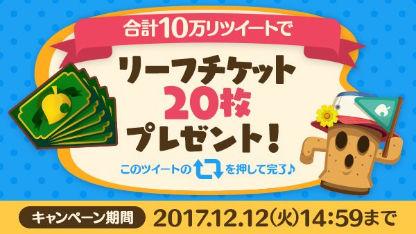 🎁RTキャンペーン🎁リリース記念!このツイートと、『どうぶつの森』海外アカウントより発信するキャンペーンツイートが【合計10万リツイート】達成で、後日【リーフチケット20枚】を全員プレゼント!!さっそくRTしてくださヒね💡フォローもお忘れなく〜😃#ポケ森RTキャンペーン pic.twitter.com/bfOr7rrlAs— どうぶつの森 ポケットキャンプ (@pokemori_jp) December 8, 2017