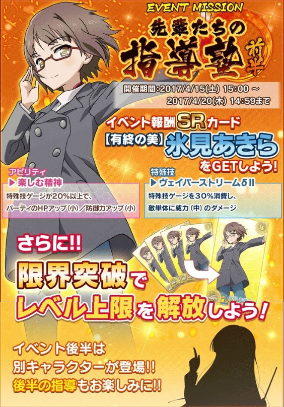 イベントポイントの累積やランキング上位入選で、イベントSR「【有終の美】氷見あきら」を複数獲得できます。また、限界突破でカード強化のチャンスです。