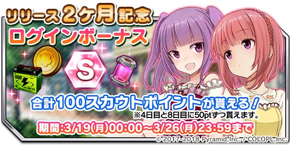 本日 3/19(月)0:00〜3/26(月)23:59まで、リリース2ヶ月記念のログインボーナスが貰えるっス!!期間中のログインで合計100スカウトポイントが!!ふふふ…(*´ω`*)ぜひ、期間中にログインしてほしいっス(っ´ω`c) #アリスギア pic.twitter.com/vq2fCcfbTM— 【公式】アリス・ギア・アイギス (@colopl_alice) March 19, 2018