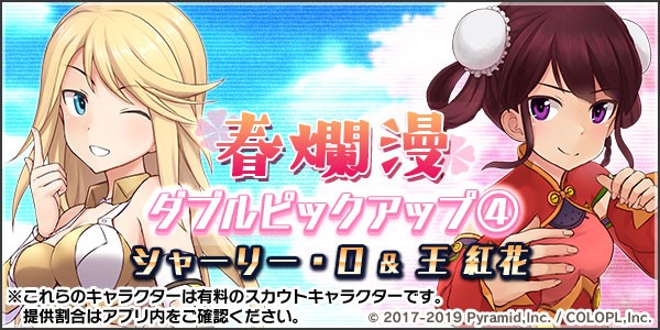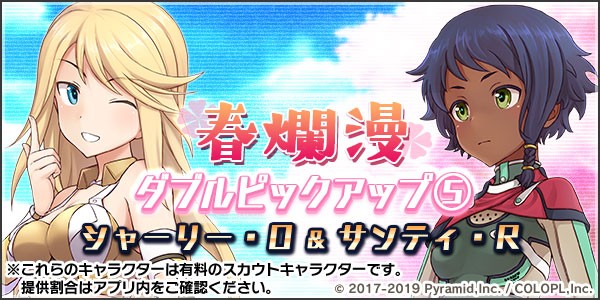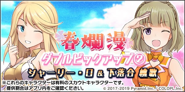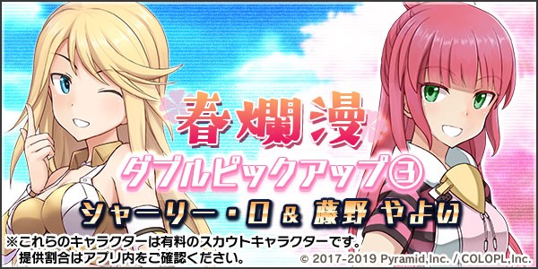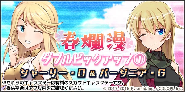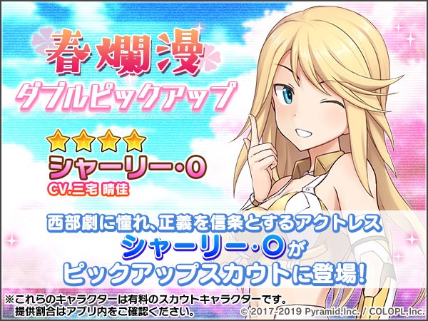 本日2019年3月29日(金)15:00より、春爛漫キャンペーンの一環として、新アクトレス「シャーリー・O(CV:三宅 晴佳)」の★4キャラクターを軸に、「バージニア・G(CV:大西 沙織)」「下落合 桃歌(CV:谷口 夢奈)」「藤野 やよい(CV:田中 あいみ)」「王 紅花(CV:戸田 めぐみ)」「サンティ・R(CV:花守 ゆみり)」の★4キャラクターとの「ダブルピックアップ形式」のスカウトが開催されます。