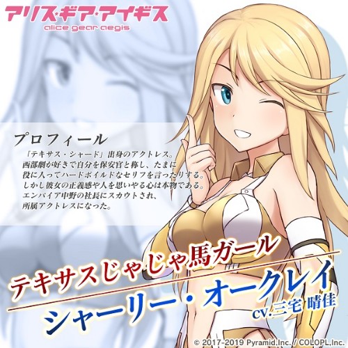 『アリス・ギア・アイギス』にて、本日2019年3月29日(金)15:00より、新アクトレス「シャーリー・O(CV:三宅 晴佳)」が登場する新イベント「続・酪農物語 ~ファザー牧場で決闘!?~」が開催中です。