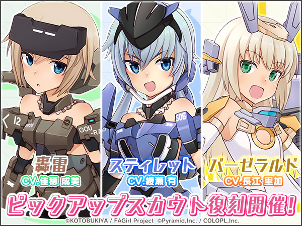 本スカウトでは、イベントで活躍する「★4 轟雷(CV:佳穂成美)」「★4 スティレット(CV:綾瀬有)」「★4 バーゼラルド(CV:長江里加)」「★4 フレズヴェルク(CV:阿部里果)」がピックアップされています。