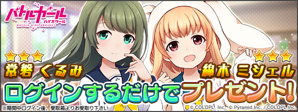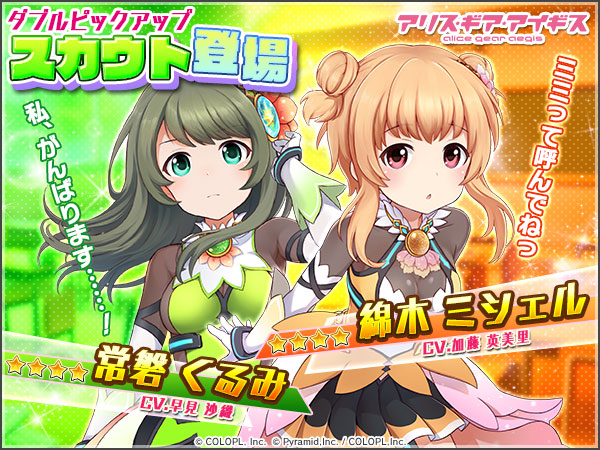 本スカウトでは、イベントで活躍する「★4 常磐 くるみ(CV:早見沙織)」「★4 綿木 ミシェル(CV:加藤英美里)」が復刻し、ピックアップされます。
