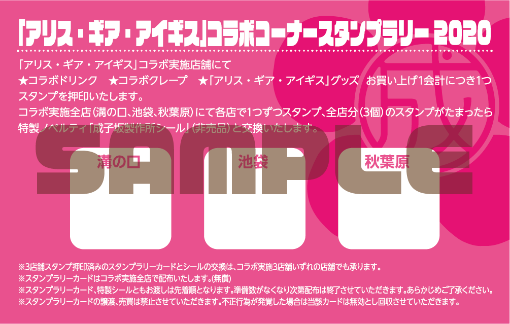 コラボ実施全店(溝の口、秋葉原、池袋)各店で1つずつスタンプ、全店分(3個)のスタンプを貯めると、特製ノベルティ(非売品『アリスギア』成子坂製作所シール)と交換することができます。