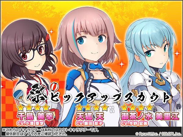 本スカウトでは、新アクトレス「★4 天狐 天(CV:飯田友子)」と、イベントで活躍する「★4 千島 美幸(CV:小澤亜李)」「★4 御茶ノ水 美里江(CV:今野宏美)」がピックアップされています。