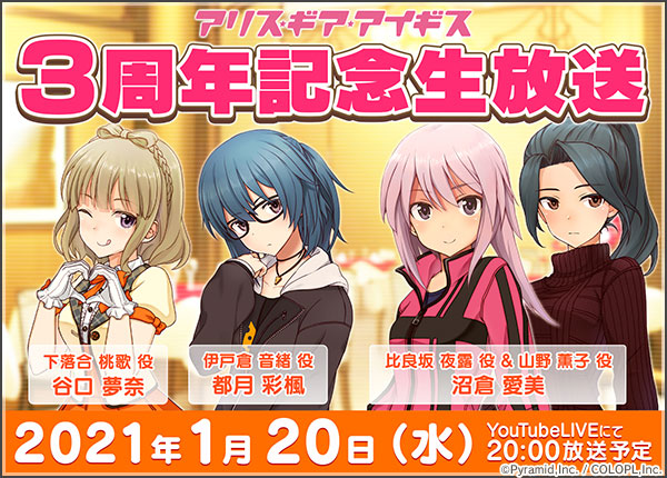 『アリス・ギア・アイギス(アリスギア)』にて、2021年1月20日(水)20:00より、「3周年記念生放送」が配信されます。