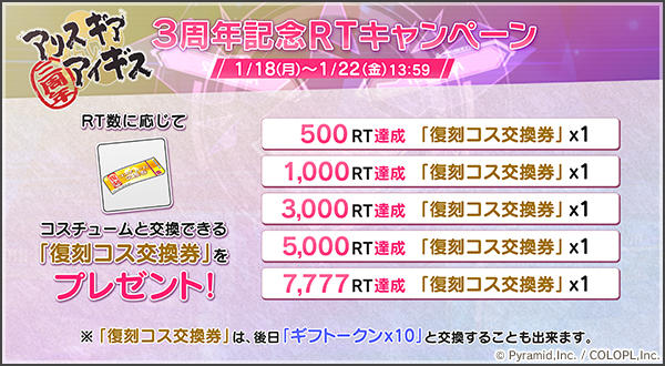 本日1月18日(月)より、「3周年記念RTキャンペーン」が実施中です。