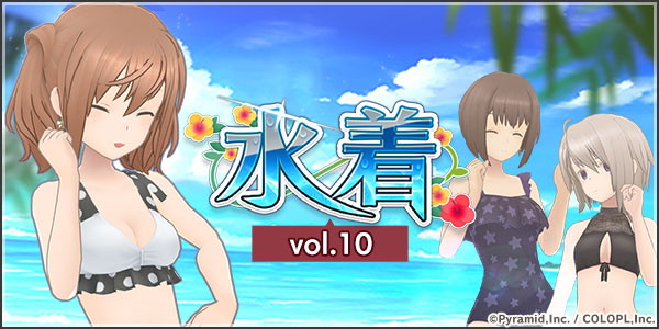 「村尾 未羅(CV:山岡 ゆり)」、「君影 唯(CV:加隈 亜衣)」、「須賀 乙莉(CV:高野 麻里佳)」の3名の水着がラインナップされた「水着コレクションvol.10」が開催されています。