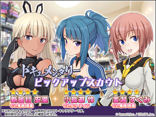本スカウトでは、「★4 金潟 すぐみ」「★4 新居目 安里(CV:鬼頭明里)」「★4 小鳥遊 怜(CV:ルゥティン)」のスカウト率がアップしています。