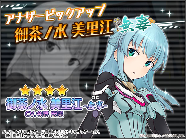 本スカウトでは、「御茶ノ水 美里江」のアナザーキャラクター「★4 御茶ノ水 美里江【無辜】」が新登場し、スカウト率がアップしています。