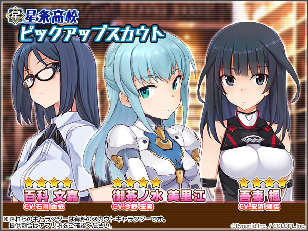 本スカウトでは、「★4 御茶ノ水 美里江」「★4 百科 文嘉」「★4 吾妻 楓」のスカウト率がアップしています。