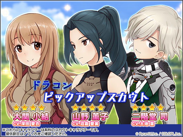 本スカウトでは、イベントで活躍する「★4 二階堂 司(CV:大地葉)」「★4 山野 薫子(CV:沼倉愛美)」「★4 大関 小結(CV:深田愛衣)」のスカウト率がアップしています。