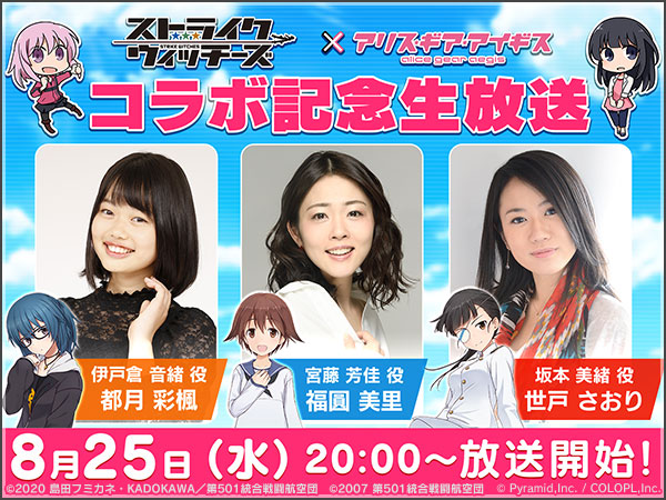 本番組では、『アリスギア』から「伊戸倉 音緒」役の都月彩楓さん、「ストライクウィッチーズ」から「宮藤 芳佳」役の福圓美里さんと「坂本 美緒」役の世戸さおりさんが出演し、今回のコラボ情報を紹介します。
