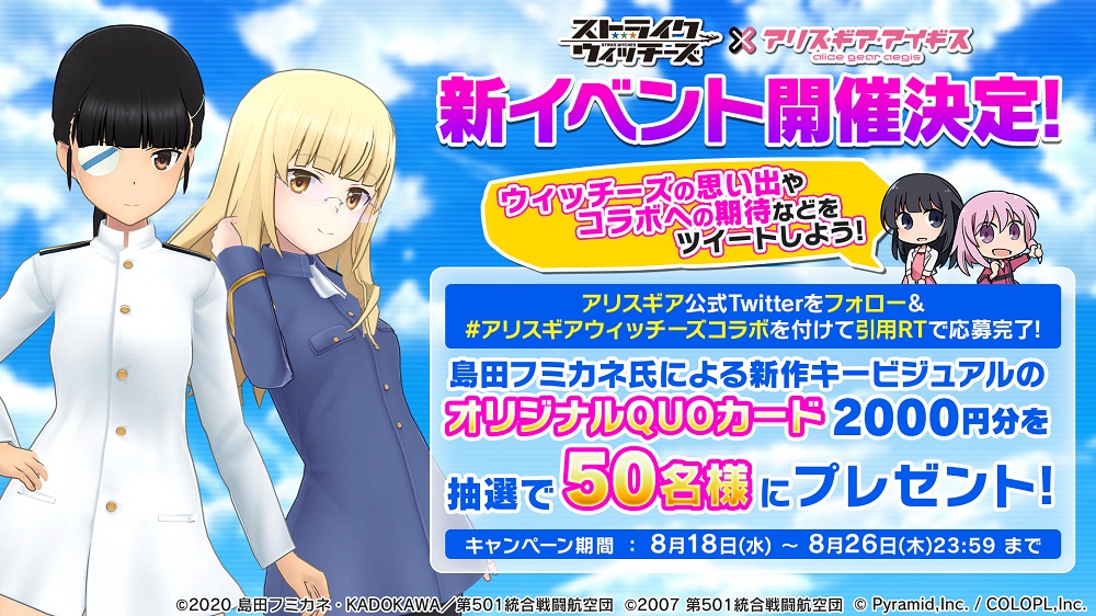 本キャンペーンでは、公式Twitterアカウント(@colopl_alice)をフォローし、ハッシュタグ「#アリスギアウィッチーズコラボ」をつけて、対象ツイートを引用RTすると、抽選で50名に島田フミカネ氏による新作キービジュアルが描かれたオリジナルQUOカード2,000円分が当たります。
