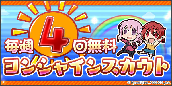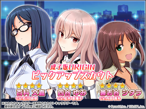 本スカウトでは、「★4 四谷 ゆみ(CV:松井恵理子)」「★4 兼志谷 シタラ(CV:内田真礼)」「★4 百科 文嘉(CV:石川由依)」のスカウト率がアップしています。