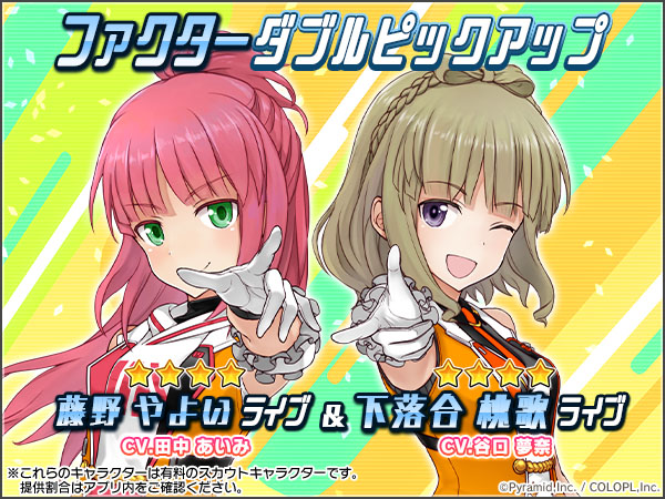 本スカウトでは、ファクター★4キャラクター「藤野 やよい【ライブ】」「下落合 桃歌【ライブ】」のスカウト率がアップしています。