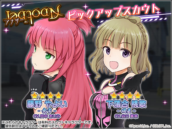 それぞれのスカウトでは、アナザー★4キャラクター「藤野 やよい【無常】」、アナザー★4キャラクター「下落合 桃歌【明星】」などのスカウト率がアップしています。