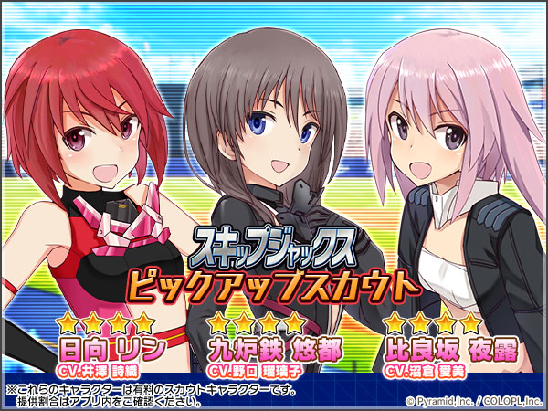 本スカウトでは、イベントに登場するノーマル★4キャラクター「九炉鉄 悠都」「比良坂 夜露」「日向 リン」のスカウト率がアップしています。