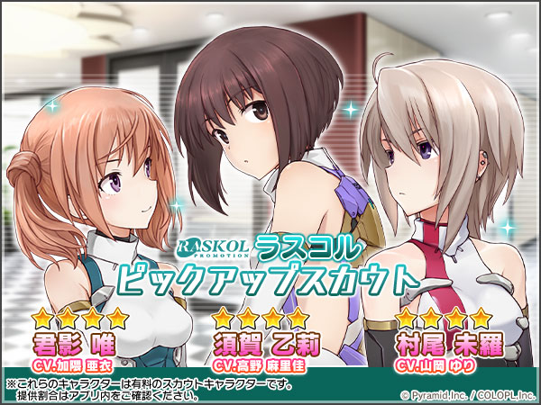 本スカウトでは、「村尾 未羅(CV:山岡ゆり)」「君影 唯(CV:加隈亜衣)」「須賀 乙莉(CV:高野麻里佳)」のスカウト率がアップしています。
