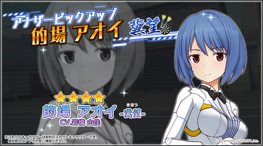 本スカウトでは、新アナザー★4キャラクター「的場 アオイ【冀望】(CV:岩橋由佳)」のスカウト率がアップしています。
