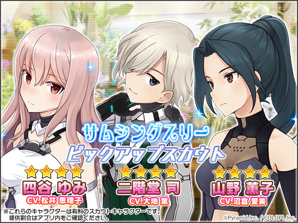 本スカウトでは、イベントで活躍するノーマル★4キャラクター「二階堂 司(CV:大地葉)」「山野 薫子(CV:沼倉愛美)」「四谷 ゆみ(CV:松井恵理子)」のスカウト率がアップしています。