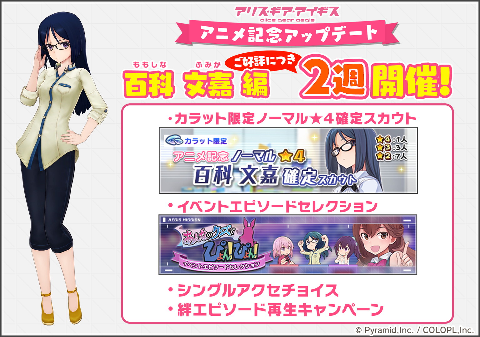期間中、「百科 文嘉(CV:石川由依)」に関連したカラット限定スカウトや、各種キャンペーンが開催されています。