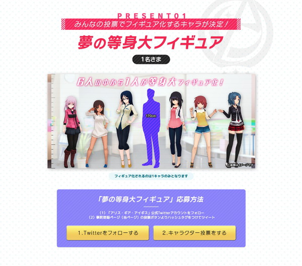 本キャンペーンは、Twitterをフォローして、事前登録ページの投票ページより指定のハッシュタグをつけてツイートすると、抽選で「等身大フィギュア」(1名)や、メインキャスト6名のサイン色紙セット(3名)をプレゼント!
