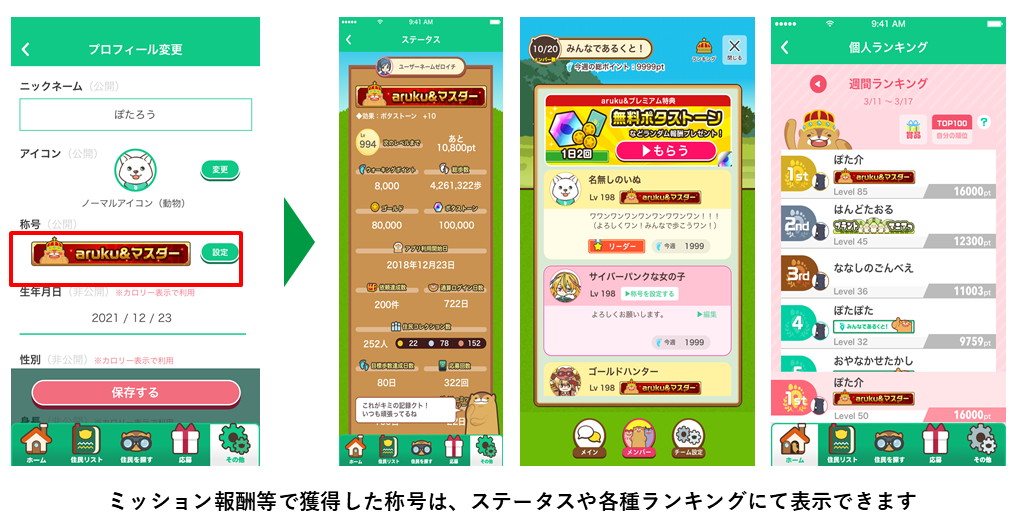 「称号」は、ランキング内で表示されるアプリ内エンブレムです。称号ごとにデザインが異なります。ミッション報酬やショップでの購入、「aruku&プレミアム」への加入などアプリ内の様々なシーンで獲得することができます。さらに、「称号」は設定するだけで、特定期間中に獲得できるポタストーン増加など特別な効果が発生するイベントも予定しています。