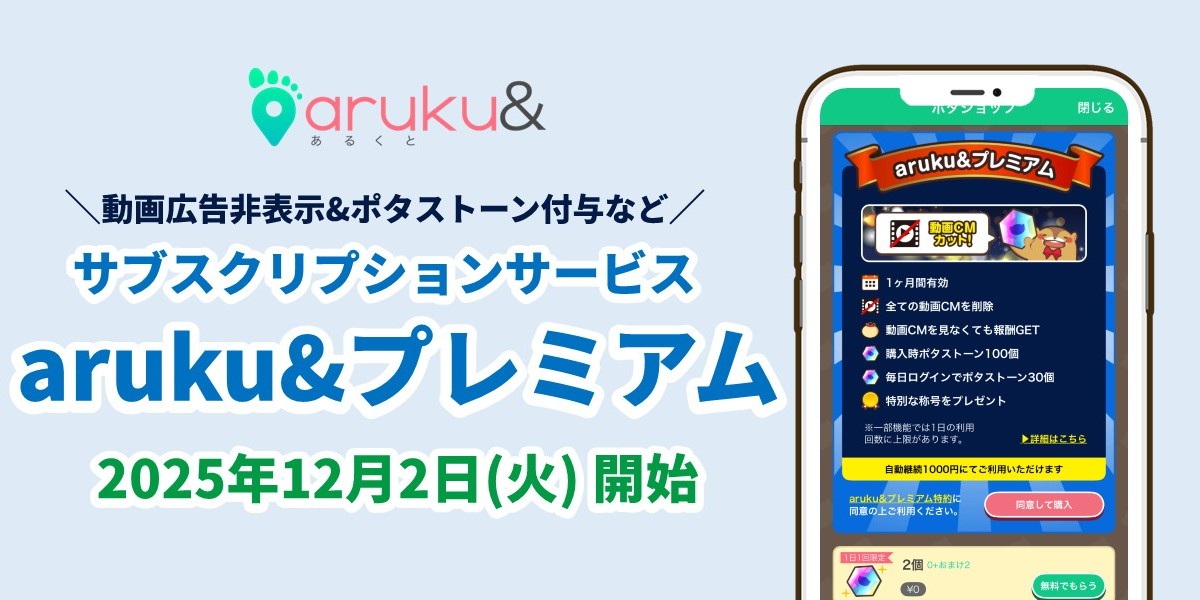 歩いてポイントが貯まるウォーキングアプリ『aruku&(あるくと)』にて、2025年12月2日(火)より、「aruku&プレミアム」の提供が開始されました。