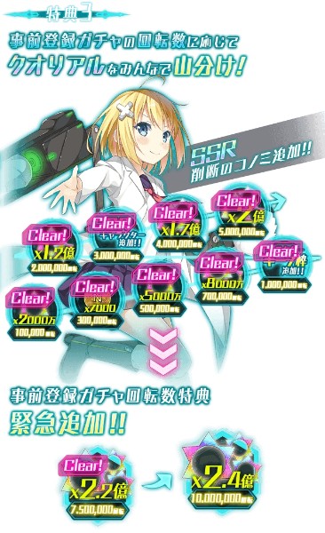 事前登録ガチャ1,000万回転達成時に、「事前登録者で山分けクオリアル」が2.2億から2.4億になる追加報酬が決定しました。
