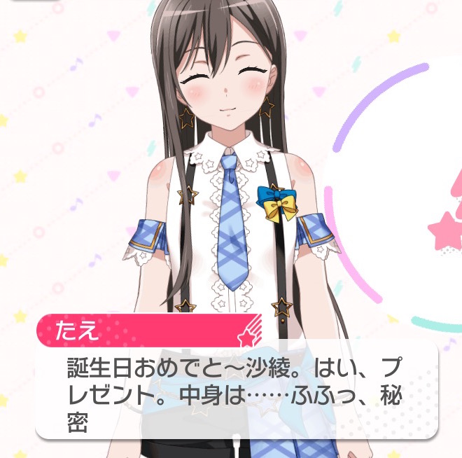 誕生日記念として『バンドリ!(ガルパ)』にログインすると、「スター50個」がプレゼントされます。さらに、バンドメンバーの「沙綾への誕生日お祝いセリフ」を聞くことができるので、忘れずにログインしましょう!