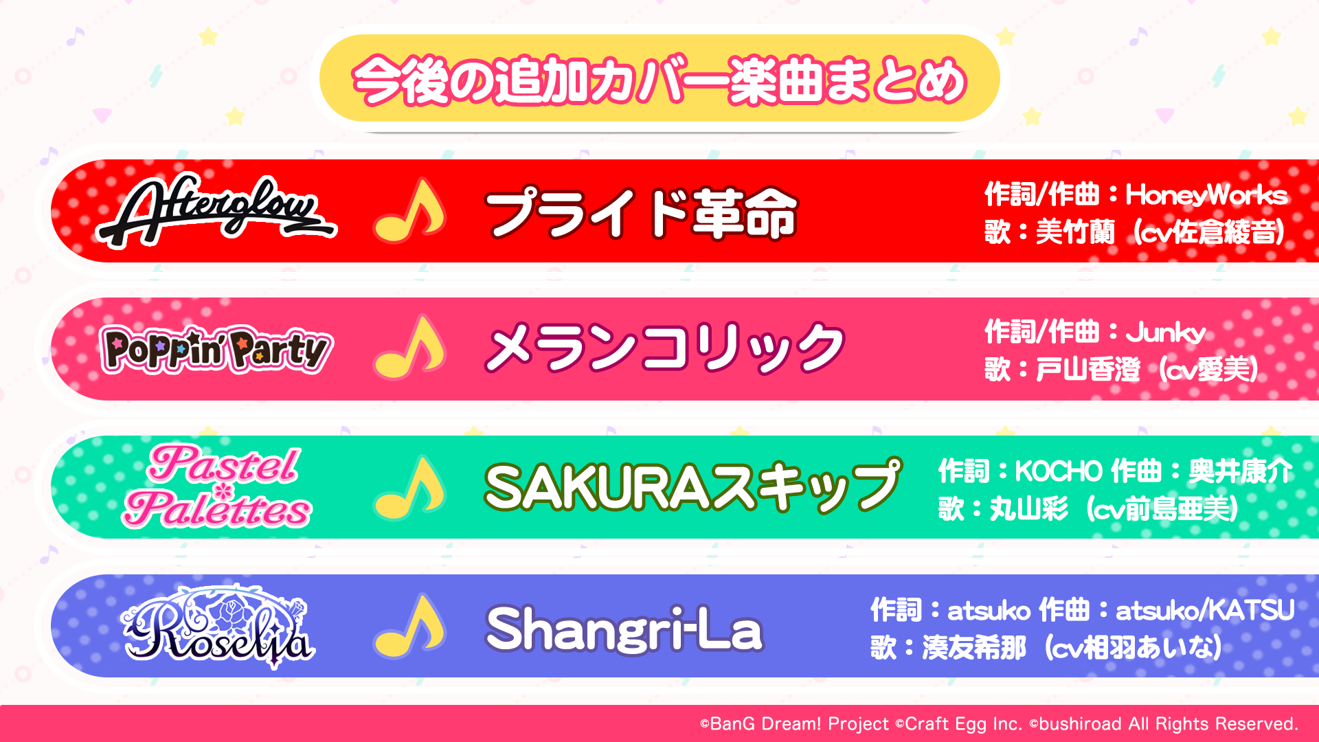 イラストの公開を記念して、秋葉原駅・渋谷駅などの駅や周辺地域にて、大規模な広告掲載を開始。また、今後アプリ内に追加するカバー楽曲として、「プライド革命」「メランコリック」「SAKURA スキップ」「Shangri-La」の4曲が発表されました。
