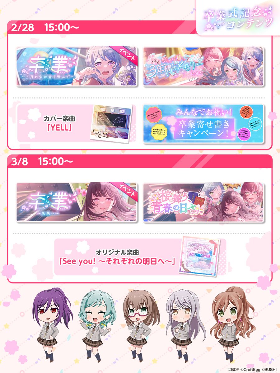 『バンドリ!ガールズバンドパーティ!(ガルパ)』にて、2023年2月26日(日)より、「高校生活メモリアルムービー」の再生リストが公開されました。また、卒業式記念イベント・ガチャが開催予定です。