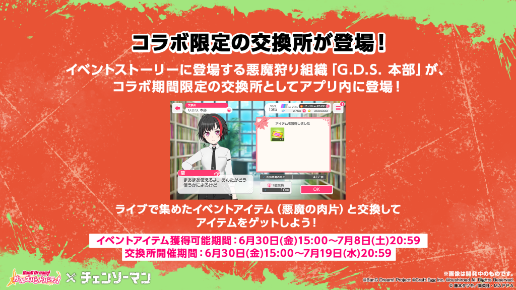 コラボ期間限定交換所 として、イベントストーリー に登場する悪魔狩り組織「G.D.S. 本部」 が登場します。 本交換所では、ライブ で獲得できるイベントアイテム「悪魔の肉片」 と各種アイテム を交換することができます。