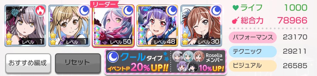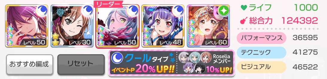 前回は特定のタイプのメンバーとのボーナス差が大きかったのですが、今回はクールタイプを編成してライブをすると20%アップ!さらに「Roselia」のメンバーを編成した状態でライブをすると、イベントPをより多く獲得できるようになり、これまで育成していたメンバーを編成しやすくなっています。