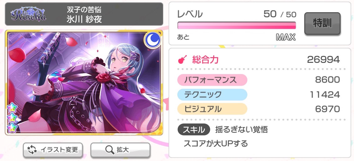 例えば、クールタイプ☆4「[鳥籠の歌姫]湊友希那」であれば、ボーナス効果が重複して30%のボーナスが得られます。