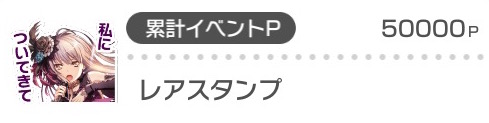 今回から「レアスタンプ」は50,000イベントP達成報酬に変更になりました。前回のイベントでは20,000イベントPで獲得可能だったので大幅に上がったように見えますが、獲得できるイベントPも上がっているので入手しやすくなっています。