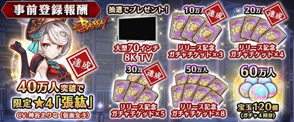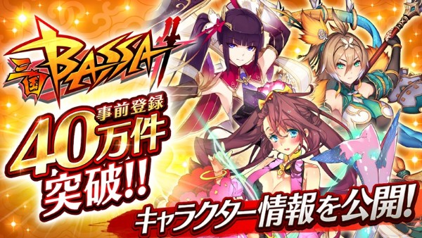 『三国BASSA!!』の事前登録キャンペーン参加数が、40万件を突破しました。達成報酬として、リリース記念ガチャチケット×12、★4限定武将「張紘(CV:神谷えりな)」がユーザー全員にプレゼント!