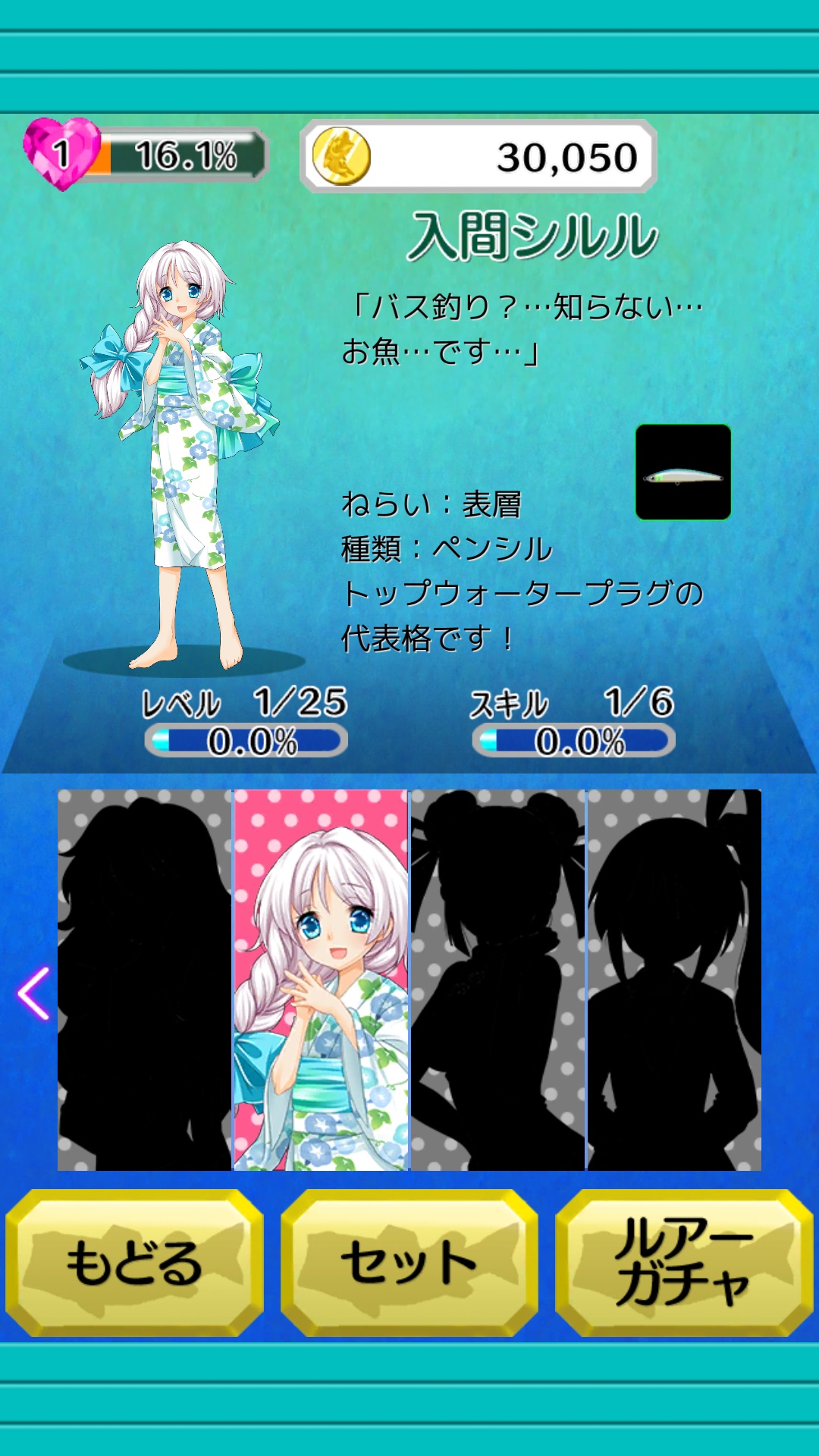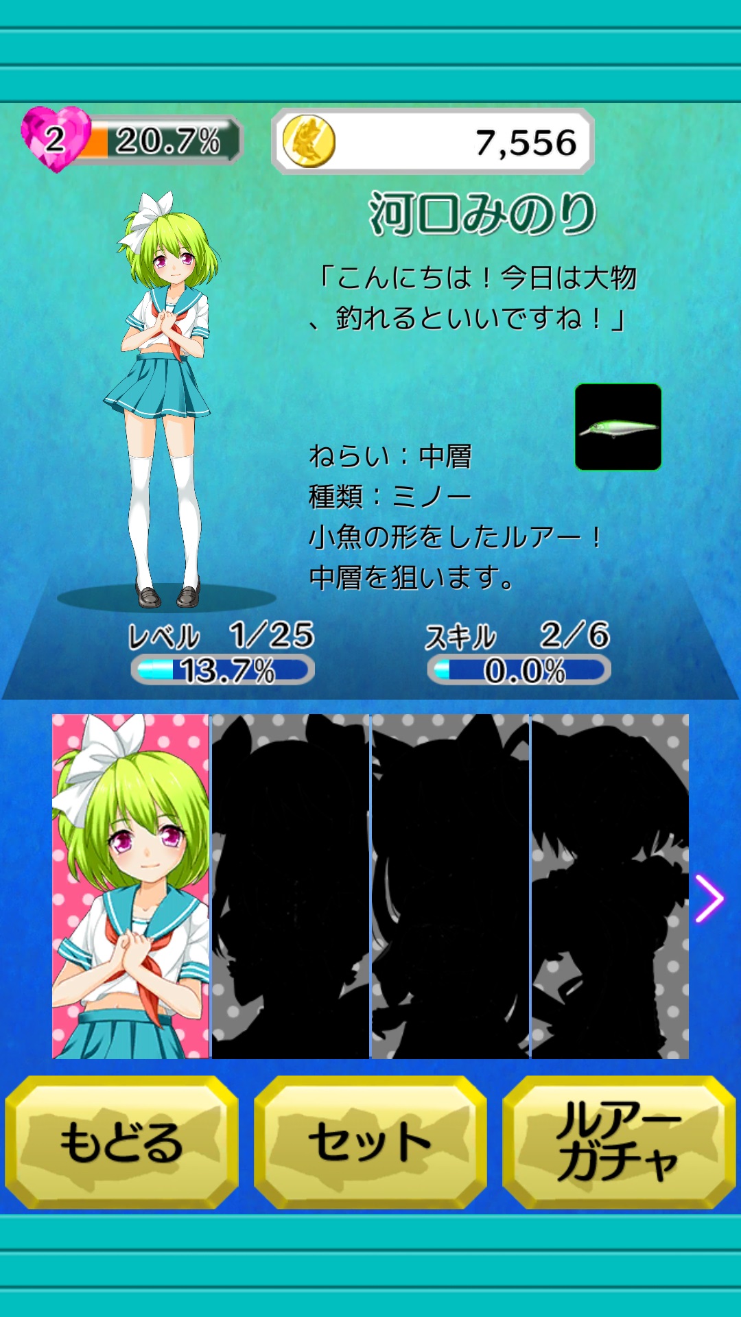 女の子たちと出会うためには、それぞれに対応したルアーをガチャでゲットする必要があります。最初に出会う河口みのりちゃん以外の女の子とは、出会いの段階から少しハードルが高めです。