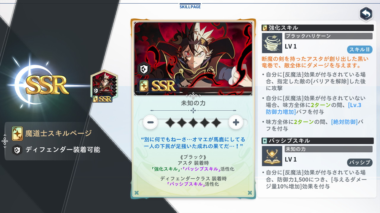 本ガチャでは、SSR魔導士「《ブラック》アスタ」と、その専用SSR魔道士スキルページ「未知の力」が復刻登場し、出現率がアップします。