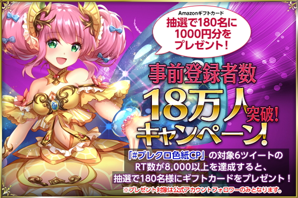 現在実施中の事前登録において、8月18日(木)時点で18万を突破しました。こちらを記念し、本日よりTwitterで開催されます。出演声優陣直筆色紙プレゼントキャンペーン第4弾の対象ツイートが、累計8,000RTを超えたら公式アカウント(@brechro)フォロワーの中から抽選で180名様にAmazonギフトカード1,000円分がプレゼントされます。