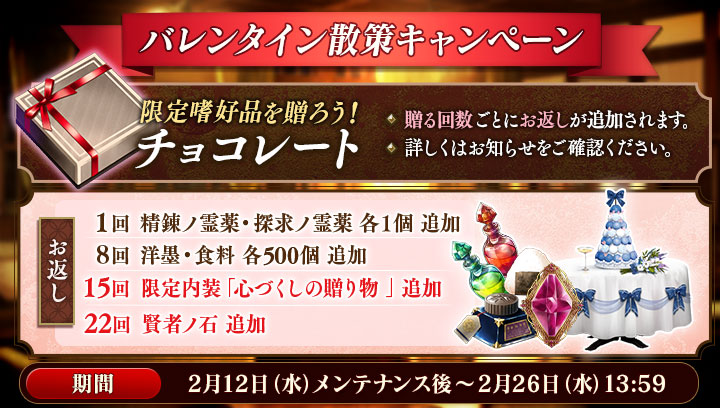 期間中、「散策」にて1日2回文豪に限定嗜好品「チョコレート」を贈ることができます。