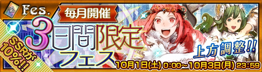 また、10月1日(土)〜10月3日(月)にかけて、上方調整された「誓いし聖王女 ユリアナ」「聖騎士団長“聖光の大輪” リフレット」が登場する、“3日間限定フェス”も開催。“3日間限定フェス”は毎月1日〜3日に開催する、SSRキャラクターの出現割合が10%の期間限定フェスです。